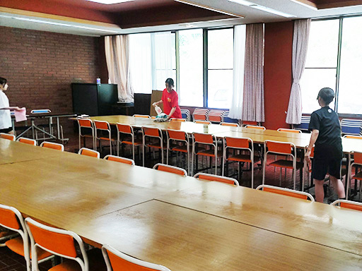 食後は、皆で協力して片づけました。食堂のお掃除を済ませ、職員の皆さんにお礼のご挨拶をしました。