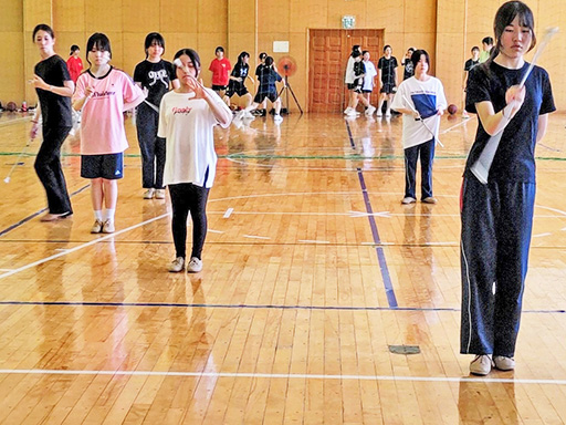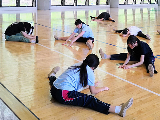 体育館で活動開始です。入念に柔軟体操をしてから、ステップとバトンの練習を行いました。