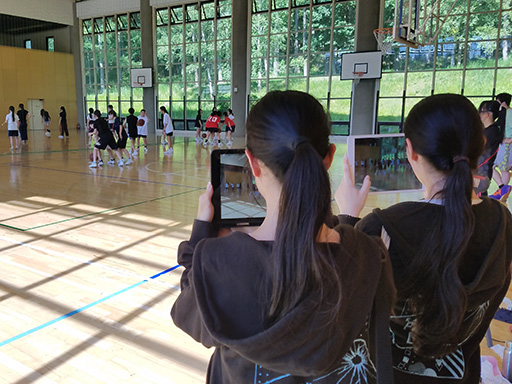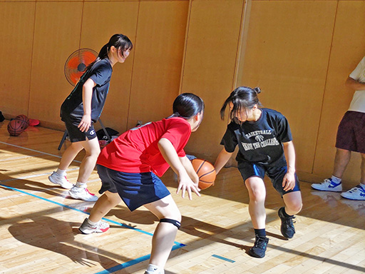 体育館で活動するバスケットボール部とバトン部の真剣な練習風景を撮影しています。バスケットボール部は、コーチが実際に対戦相手となり、実践的なシュート練習に励んでいたため、迫力のあるショットが撮れたようです。