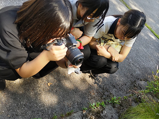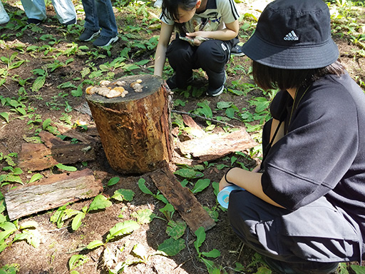 四つ葉のクローバーを探したり、触らないよう気を付けながらキノコが生えた古い切り株を観察したりしました。細い清流をジャンプして飛び越える姿も見られ、さっそく自然豊かな場所ならではの体験をレンズに収めることができました。