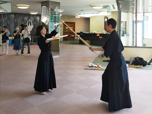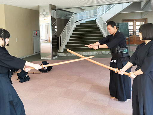 山荘のエントランスで、剣道形のおさらいをしながら、先生にアドバイスをいただきました。