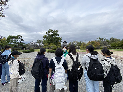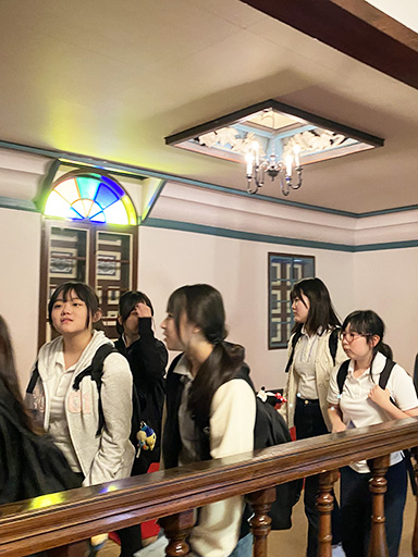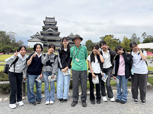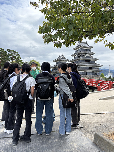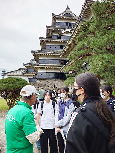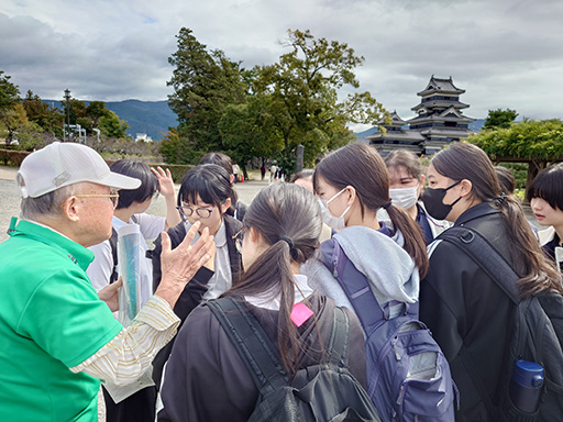 食後は、旧開智学校の見学をしました。青空の中、国宝になった校舎をガイドさんの案内で見学しました。