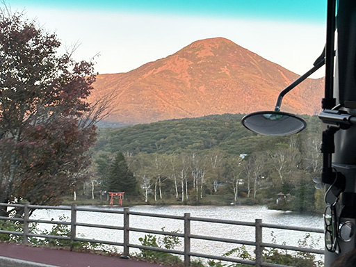 山荘に戻る時、蓼科山が夕日に照らされて赤く色づいていました。