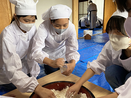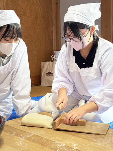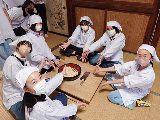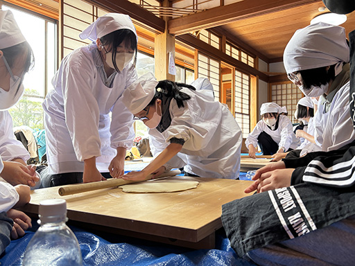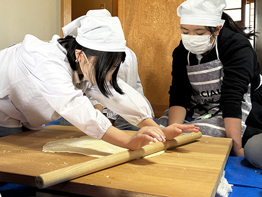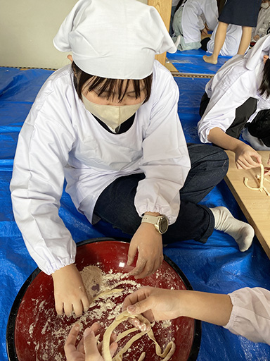 最終日は山梨県忍野村での名産ほうとう作り体験です。小麦粉に水を入れながら力いっぱいこねました。足でも踏みます。「美味しくなーれ」と言いながら協力して作りました。