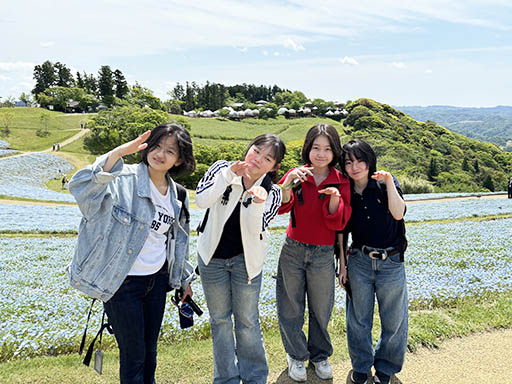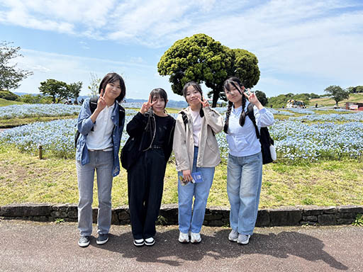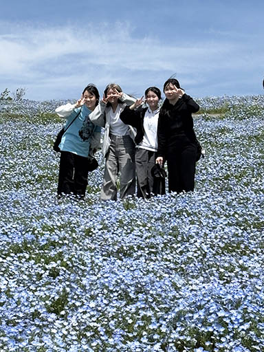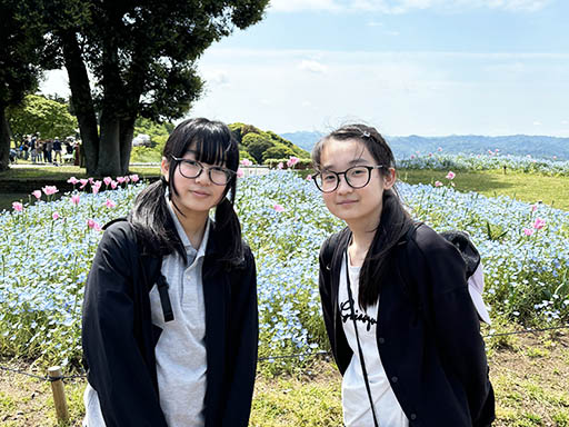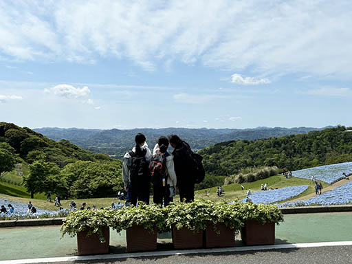 まきばの広場で、ネモフィラをバックにパチリ。ネモフィラがきれいです。