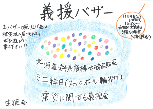 鶴友祭模擬店、生徒会義援バザー及び同窓会バザーの収益金と被災地義援募金を北海道、岩手県、千葉県、熊本県に災害義援金として寄付いたしました。