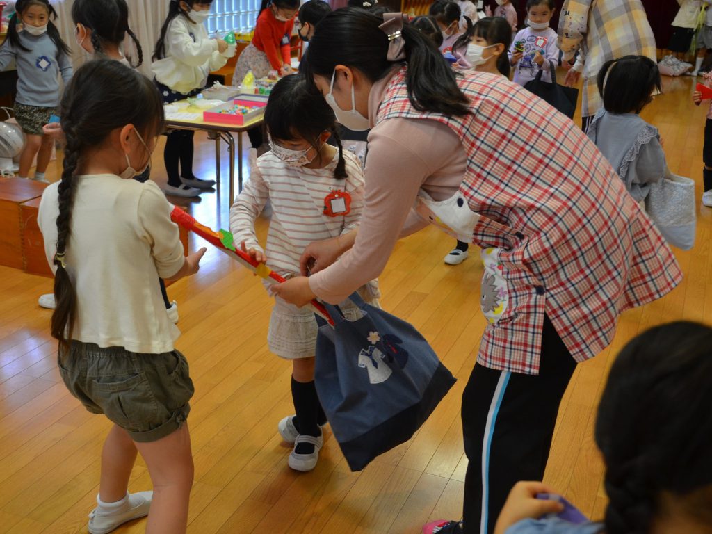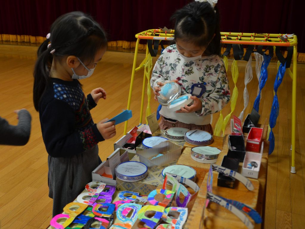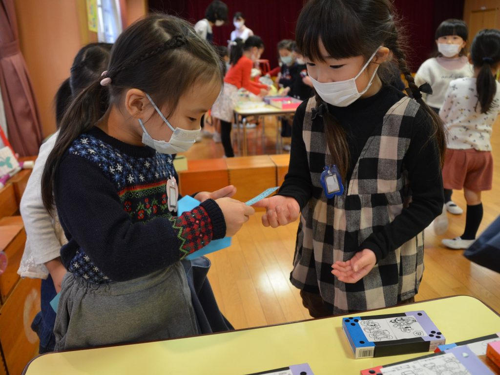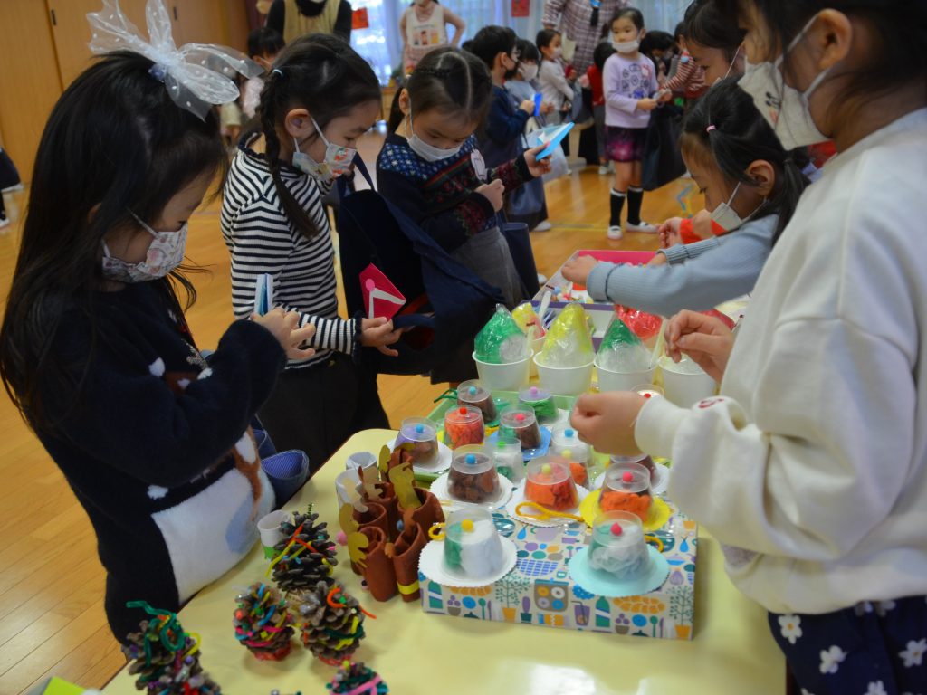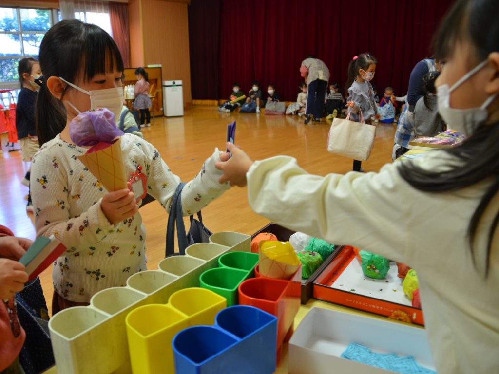 年長組のお姉さん、お兄さんから、年中組・年少組・つくし組のお友だちへ「おみせやさんごっこ」のお誘いがありました。みんなで考えたおみせやさん、いろいろな品物づくりが始まり、個性豊かな作品が仕上がりました。今年は、10店舗のおみせが出店し、当日は1人6枚のチケット(おかいものけん)を持ってお買い物を楽しみました。