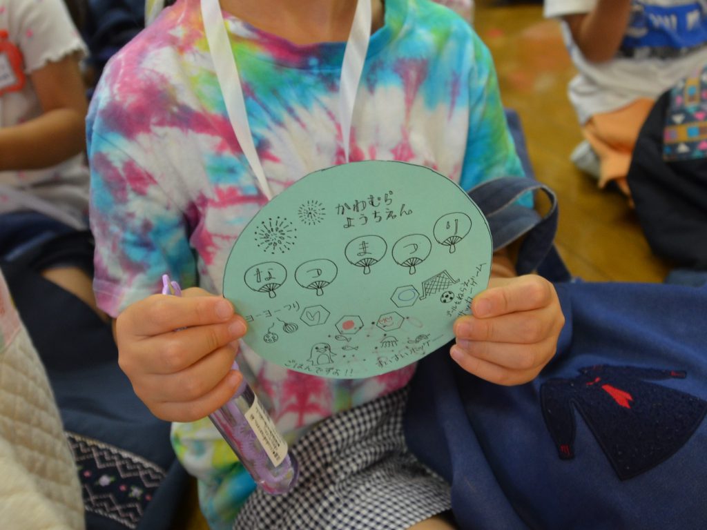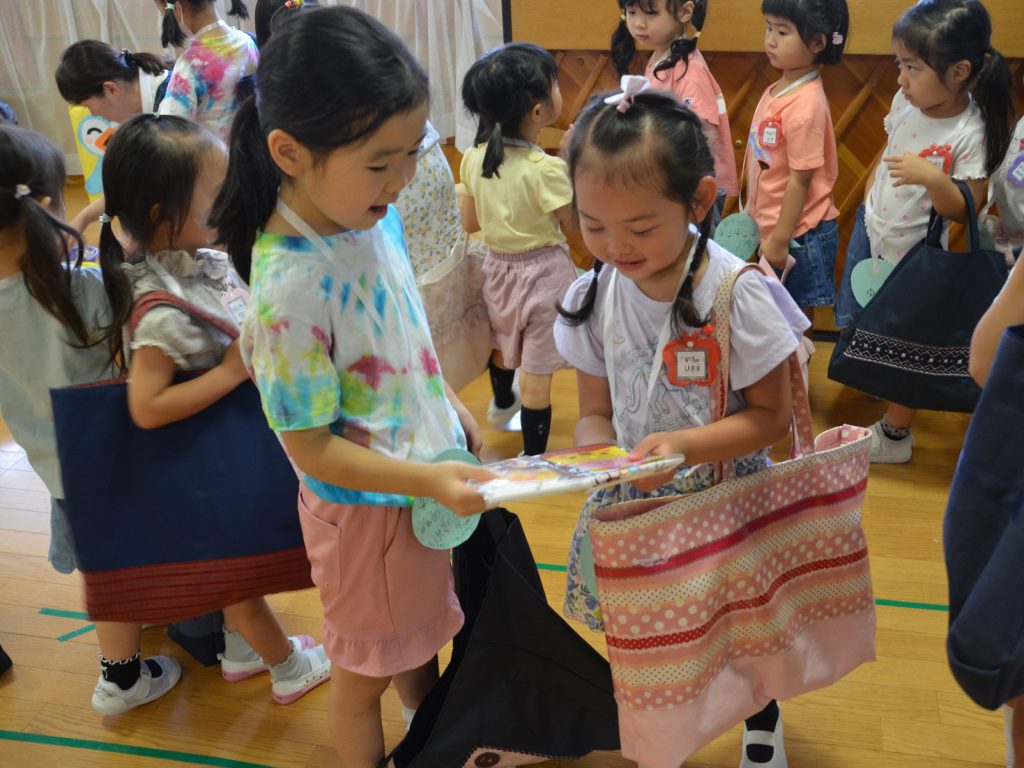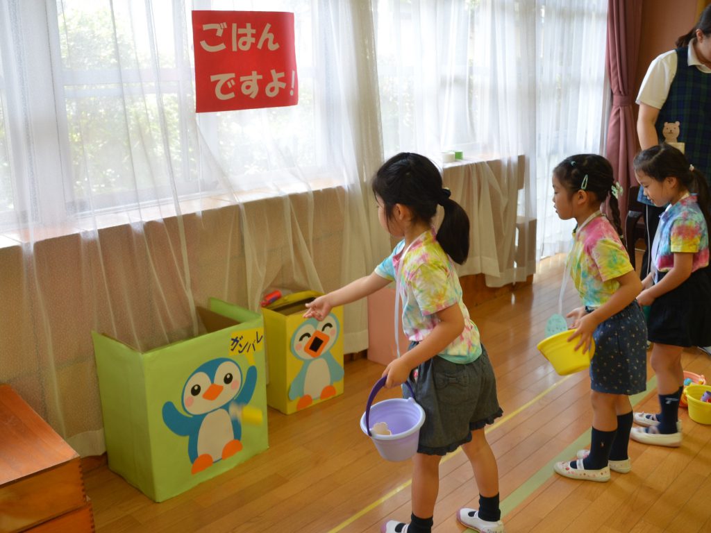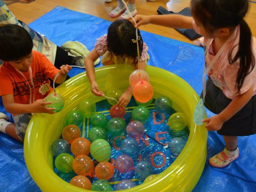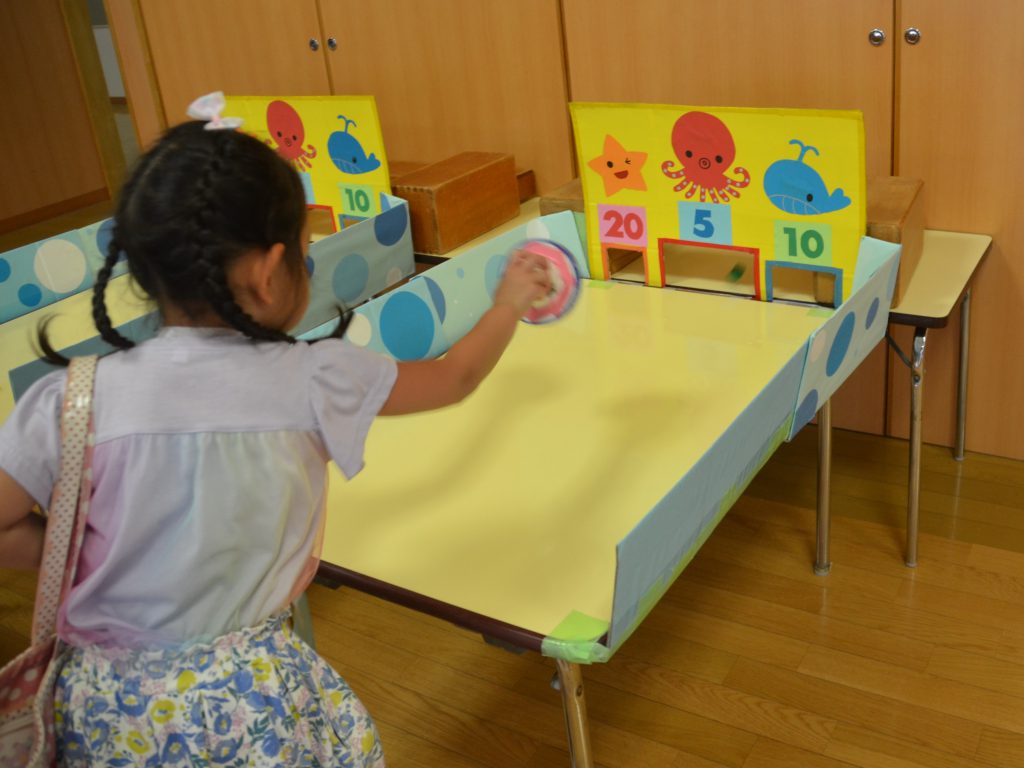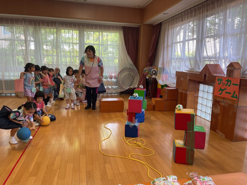 全学年がゆうぎ室に集まり、夏祭りを行いました。集中力が必要な「ヨーヨーつり」、お腹のへったペンギンさんにエサをあげる「ごはんですよ」、ペットボトルキャップを使った「すいすいホッケー」、ゴールをねらってシュートをする「サッカーゲーム」に、それぞれチャレンジしました。最後にみんなでアンパンマン音頭を踊り、楽しい夏祭りをしめくくりました。
