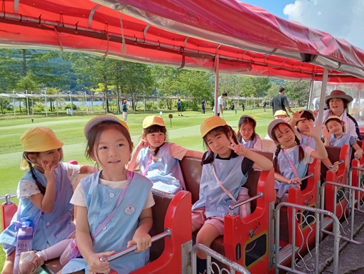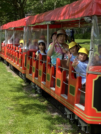 午前中は白樺リゾート池の平ファミリーランドのアスレチックへ行きました。森林鉄道にも乗りました。