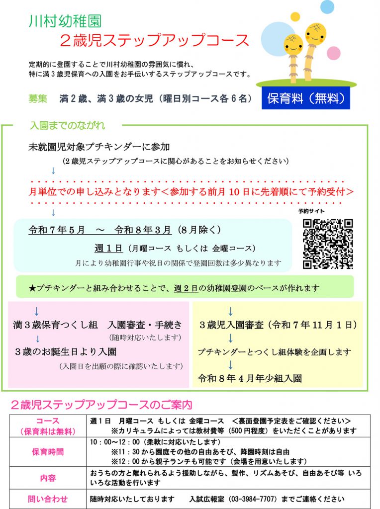 定期的に登園することで川村幼稚園の雰囲気に慣れ、特に満3歳児保育への入園をお手伝いするステップアップコースです。