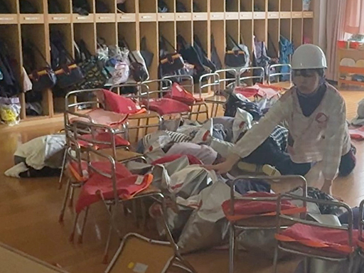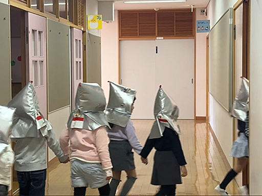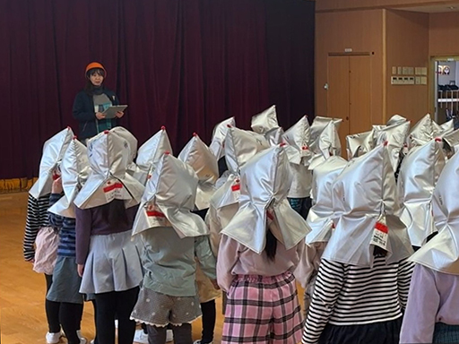 その後、防災頭巾をかぶって、ゆうぎ室に集まると、先生から「どこにいても、落ち着いて身を守りましょう」とのお話がありました。