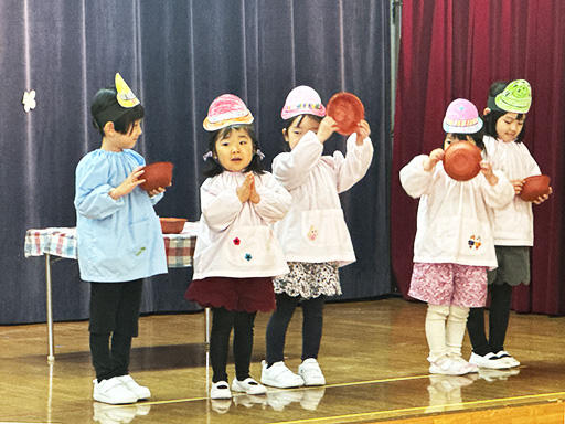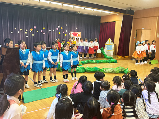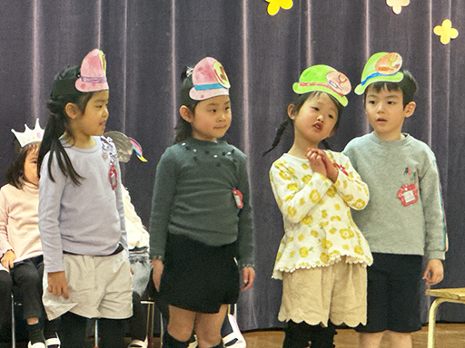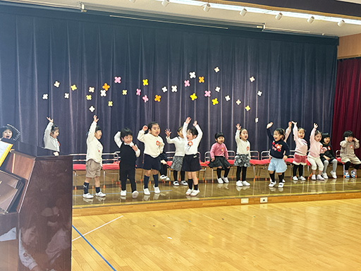 NEWS TOP NEWS 発表会 2025.03.03 発表会 令和7年2月19日(水) 1年間のしめくくりとして、「発表会」を行いました。練習してきた歌や劇を、たくさんの保護者の方に見ていただきました。緊張しながらも一生懸命発表している姿に、笑顔が溢れていました。 つくし組 手遊び&歌 年少組 劇あそび「さんびきのくま」 年中組 オペレッタ「金のがちょう」 年長組は、「ジャックと豆の木」の劇を熱演しました。 前の記事へ 次の記事へ 一覧に戻る 年代別 すべて 2025 2024 2023 2022 2021 2020 2019 2018 2017 2016 2015 2014 入試情報一覧