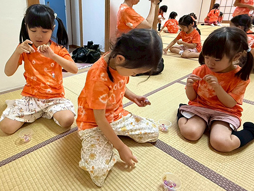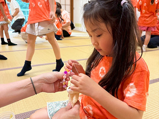 山荘に戻っておやつをいただいた後、ビーズでストラップを作り、テディベアのマスコットにつけました。