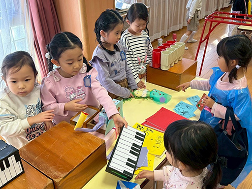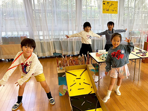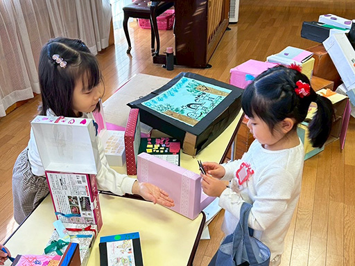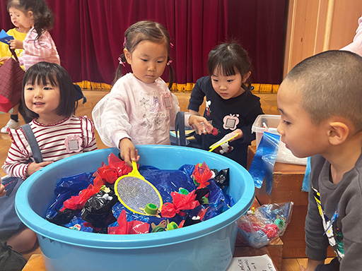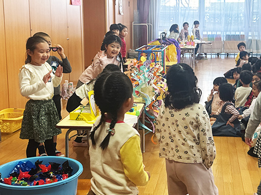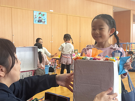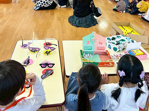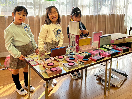 今日は、ゆうぎ室がショッピングモールに! 子ども達が工夫して作った品物がずらりと並びました。