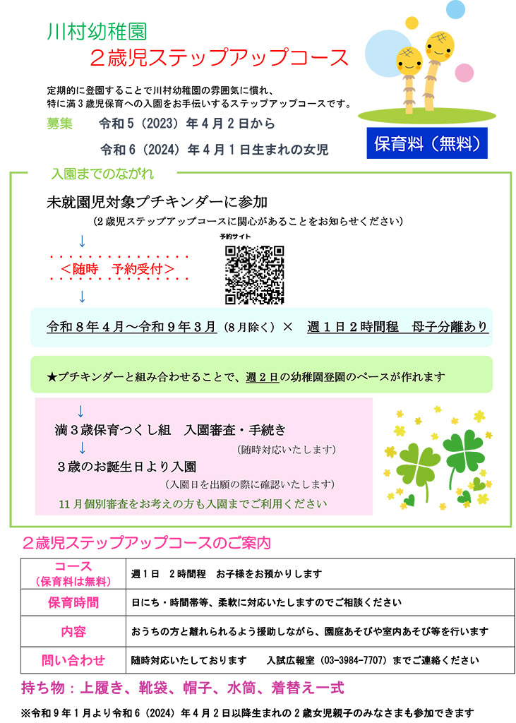 定期的に登園することで川村幼稚園の雰囲気に慣れ、特に満3歳児保育への入園をお手伝いするステップアップコースです。