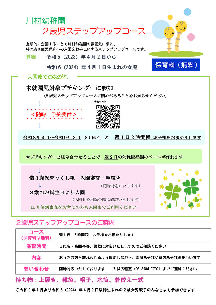 入試情報一覧 TOP 入試情報 令和8年度「2歳児ステップアップコース」について 2026.03.05 令和8年度「2歳児ステップアップコース」について 川村幼稚園では、「2歳児ステップアップコース」を行っております。定期的に登園することで川村幼稚園の雰囲気に慣れ、特に満3歳児保育への入園をお手伝いするステップアップコースです。 未就園児対象プチキンダーにご参加の女児が利用できます。 令和8年度1学期(4月~7月)の募集をしております。個別に希望の日時で組みますので、下記フォームより参加したい月をお知らせください。 2歳児ステップアップコース ご案内 2歳児ステップアップコース 申込フォーム 前の記事へ 次の記事へ 一覧に戻る 年代別 すべて 2026 2025 2023 2022 2021 NEWS