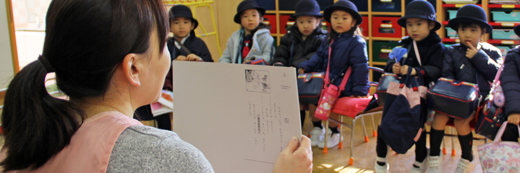 - 絵本や紙芝居の「読み聞かせ」など想像の世界、ことばの世界で遊び、心を落ち着かせます。