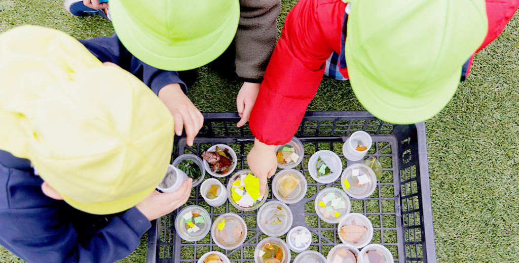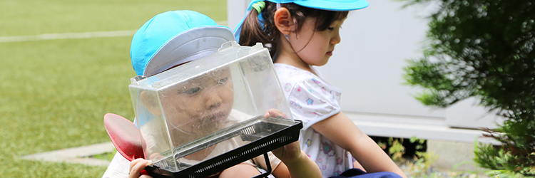 - 緑豊かな園庭で、子ども達はさまざまな遊びを見つけます。